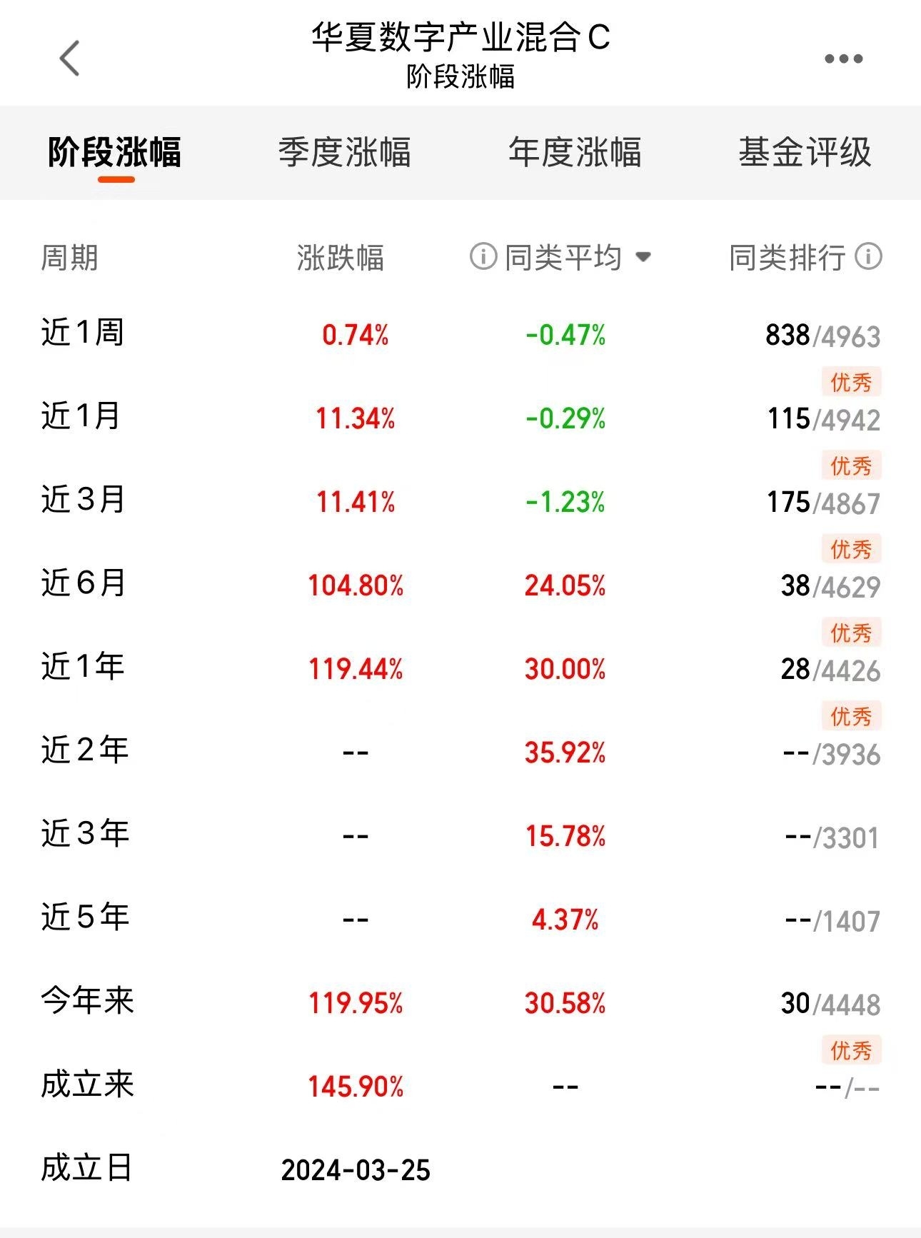 中长期维度看算力板块成长逻辑坚实,这基聚焦海外算力,爆发力真强,昨天单日上涨近6个点,$华夏数字产业混合C$各阶段表现在同类中都是优秀,值得拿