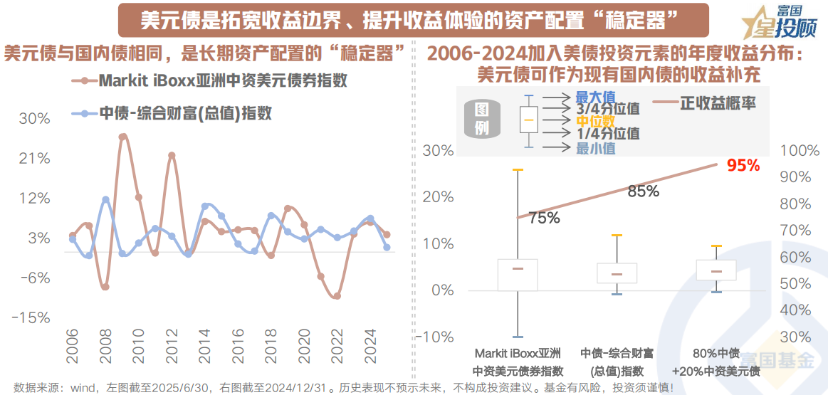 布局美元债,可作为现有国内债的收益补充。2006-2024年间,中债综合财富指数的年度收益率中位数为3.45%,正收益率概率为85%。若是加入一定的中资美元债配置,如“80%中债+20%中资美元债”的组合,其年度收益率中位数提升至4.17%,正收益概率更是提升至95%。