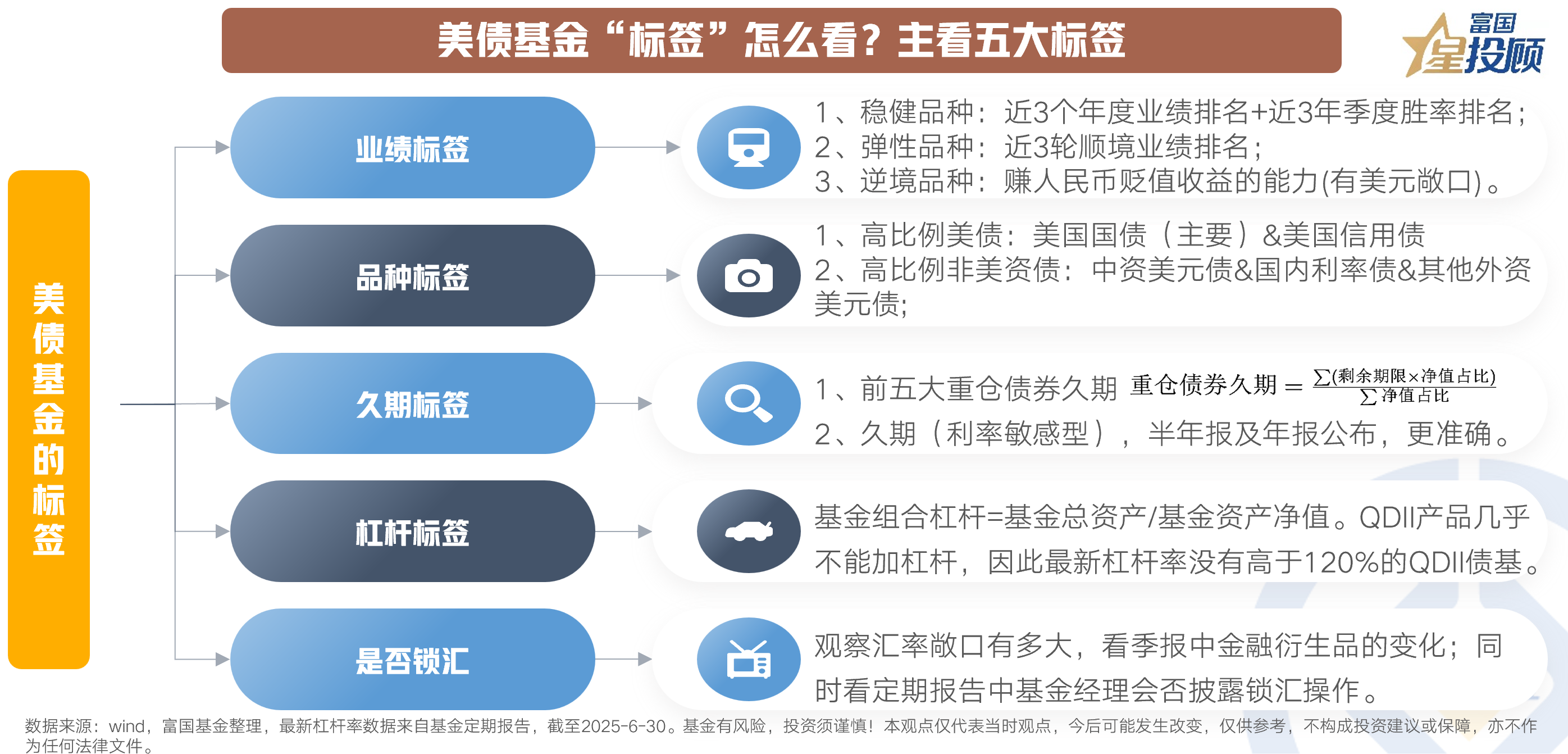 基金选择中,首先需要明确的是个人的风险偏好与所选择的基金是否匹配。其次,是选择相应的基金标签。在美债中有五大类标签需要关注。第一类,是业绩标签,投资的最终结果都体现在基金业绩上。第二类,是品种标签,投什么决定了基金大致的风险收益特征。第三类,是久期标签,收益的增加,是否是增加了风险。第四类,是杠杆类标签,收益的增加,是否是增加了杠杆。第五类,是是否锁汇的标签,收益到底是来自汇兑损益,还是债券投资。标签能让投资者更了解收益到底来自于哪里。