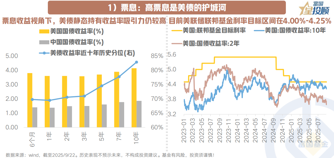 自2025/9/18美联储宣布降息25个基点、将联邦基金利率从4.25%-4.50%降至4.00%-4.25%后,截至2025/9/22美债的主要各期限收益率均在3.5%以上,且都处于近十年70%以上的较高分位数水平。这意味着不考虑资本利得,仅采用持有到期的“吃票息”策略,收益与国内债静态持有收益率相比已相当可观。