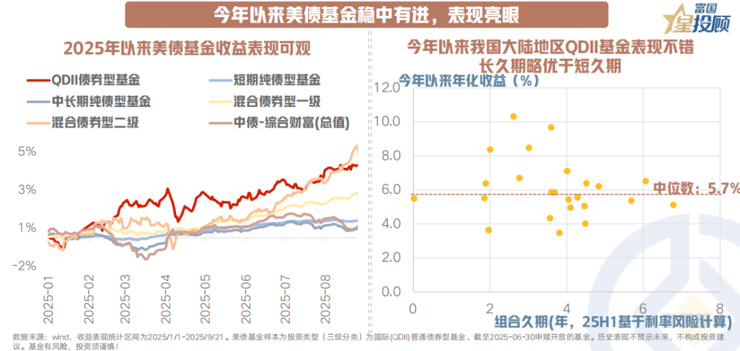 2025年以来,截至2025/9/21,QDII债券型基金指数累计上涨4.63%,与国内含权二级债基指数不相上下。进一步地,今年以来我国大陆地区QDII基金的年化收益表现中位数已近6%(截至2025/9/21),结构中长久期略优于短久期。随着全球主要经济体进入货币宽松周期,QDII债基的光环愈发迷人。