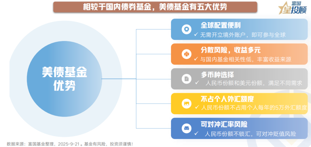 第一,全球配置便利。投资者无需开立境外账户,即可参与全球债券投资。第二,分散风险,收益多元。美债基金与国内基金相关性低,可以丰富资产配置的收益来源。第三,多币种选择。美债基金提供人民币份额和美元份额,可以满足不同投资者需求。第四,不占个人外汇额度。美债基金人民币份额不占用个人每年的5万外汇额度,资金使用更灵活。第五,可对冲汇率风险。若美债基金人民币份额不锁汇,可对冲人民币贬值风险。