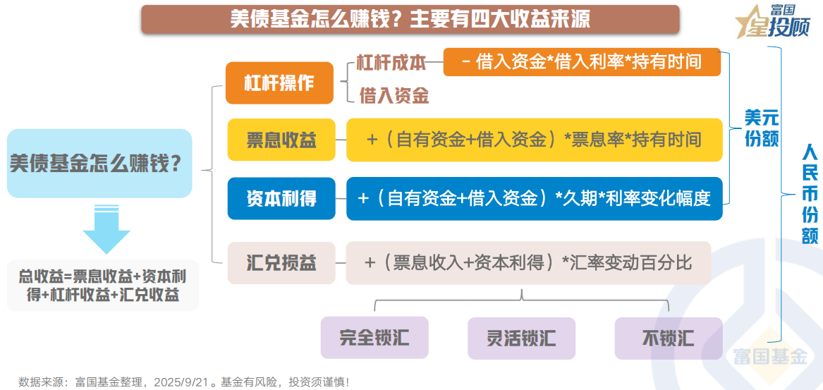 与国内债券基金相同,美债基金的主要收益来源于三大方向:票息收益、资本利得,以及杠杆收益。但与国内债券基金不同的是,美债基金还面临着汇兑损益。因为美债基金的人民币份额需要先换汇,再购买美元债券,同时卖出美元债券资产后,仍然面临着换汇为人民币的情况。所以,美债的汇兑收益不容忽视,例如人民币贬值,会对人民币份额的美债基金收益有正贡献。