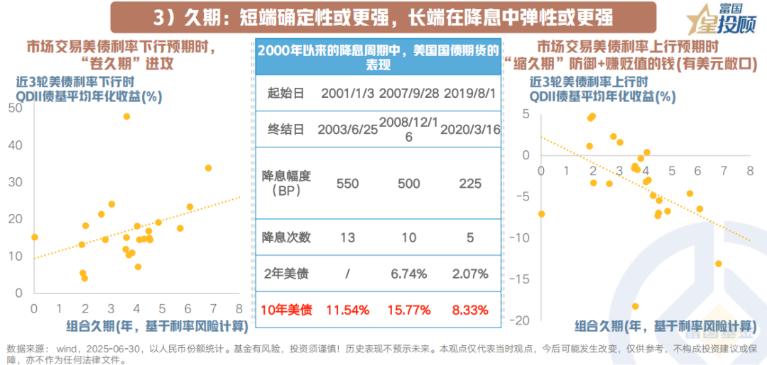 短久期御波动、求平衡,长久期擒收益。从确定性出发,如果采用持有到期策略,足够高的票息下投资短期限美债的风险收益比或更强。而从过去三轮降息周期看,当降息周期开启后,长期限美债的弹性或更强,这也正是过去一个月美债市场反应出来的情况。