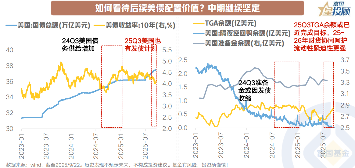 2)2024年美国债务上台阶、流动性(准备金)因发债收缩影响美债市场;而25Q3美国TGA余额(财政部一般账户)已补充至接近美国财政部所提出的三季度目标8500亿美元,且后续在其减税法案的财政扩张视角下,决策层对流动性风险的容忍度或更低,财货协同呵护流动性紧迫性更强。