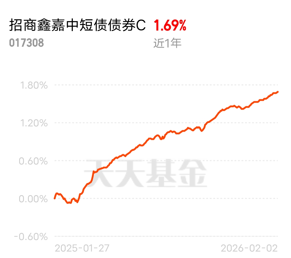 每天看股市行情闹心,涨了怕跌跌了怕亏,短债让我省心!招商鑫嘉中短债债券 C 近一年 169 个蛋,昨天微涨稳赚,比货基收益高,7 天免赎回费,招商老牌靠谱,年前肯定限购,当下接着布局。$招商鑫嘉中短债债券C$
