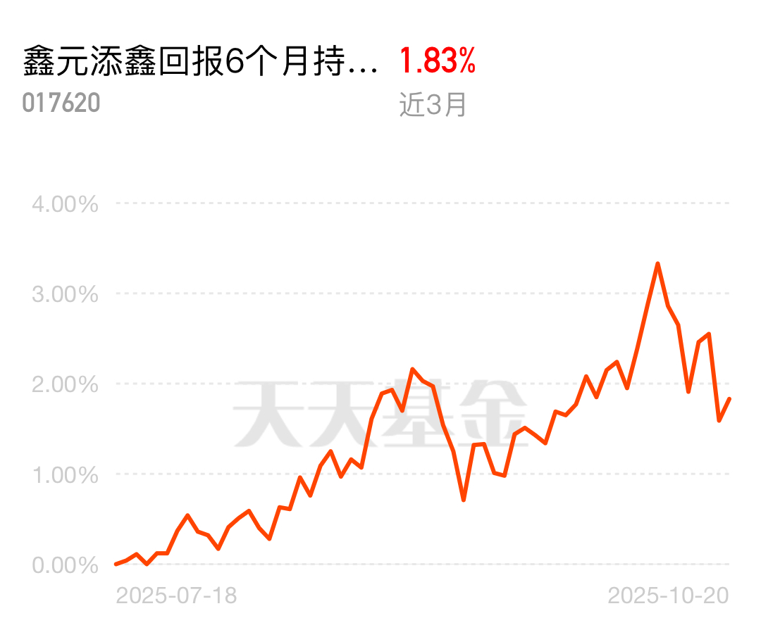 现在投资讲究个稳中求进,那些大涨大跌的产品实在熬人。鑫元添鑫回报6个月持有期混合C近3个月涨了1.83%,一步一个脚印,值得加仓跟上。$鑫元添鑫回报6个月持有期混合C$