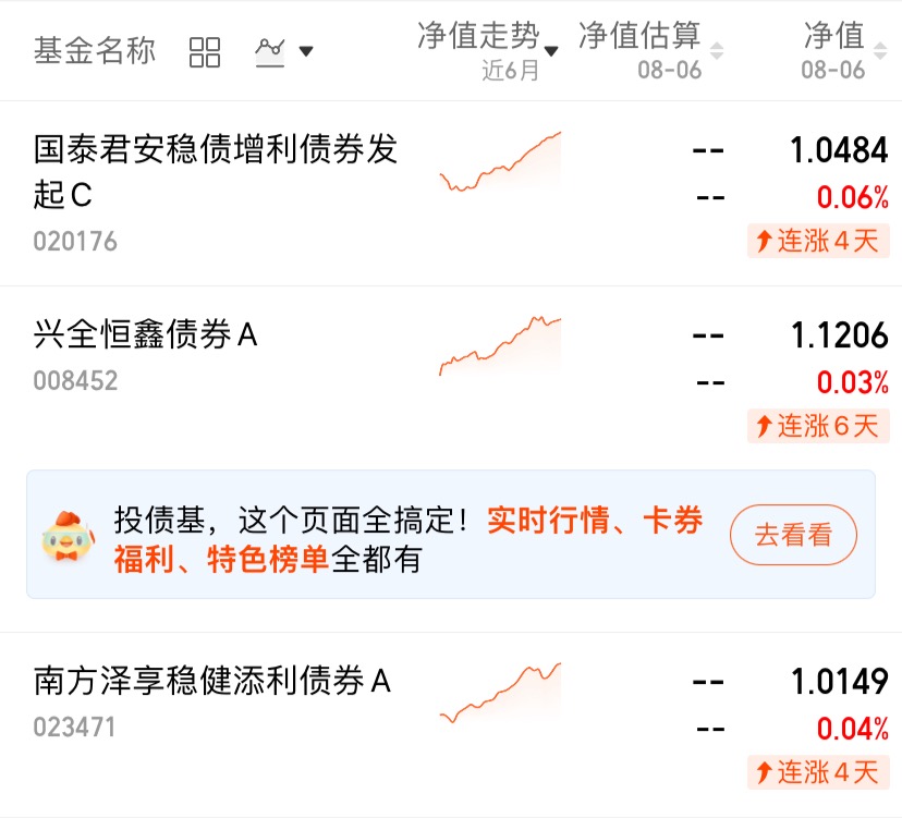 久等啦!今晚债基更新已就位,债市波动中,债基如何稳住阵脚?收益数据新鲜出炉,速来一探究竟$国泰君安稳债增利债券发起C$ 今日收益不错,6个大鹅蛋