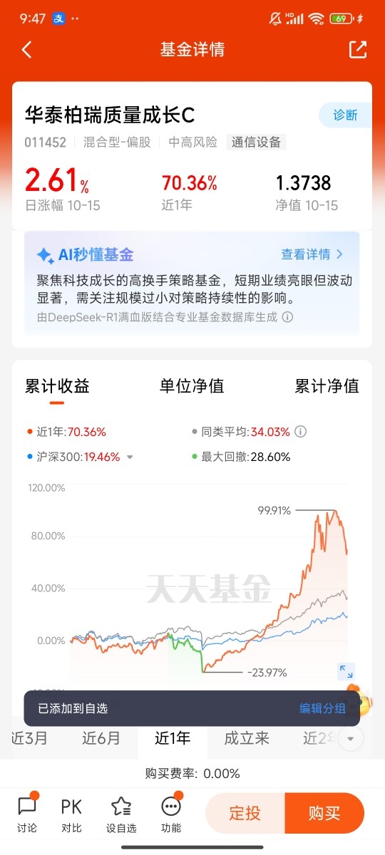 如果是缺乏择时经验的朋友,我更推荐定投。人工智能的长期趋势很明确,但短期波动谁也猜不准,而定投的“纪律性买入”能完美平滑这种波动。以华泰柏瑞质量成长A为例,每月固定一天投入固定金额,净值涨的时候买得少,调整的时候买得多,长期下来就能积累更多廉价筹码。这种方式不用费脑子盯盘,适合工作忙、没时间研究市场的普通投资者,相当于把专业的事交给基金经理,自己只需要坚持纪律就行。