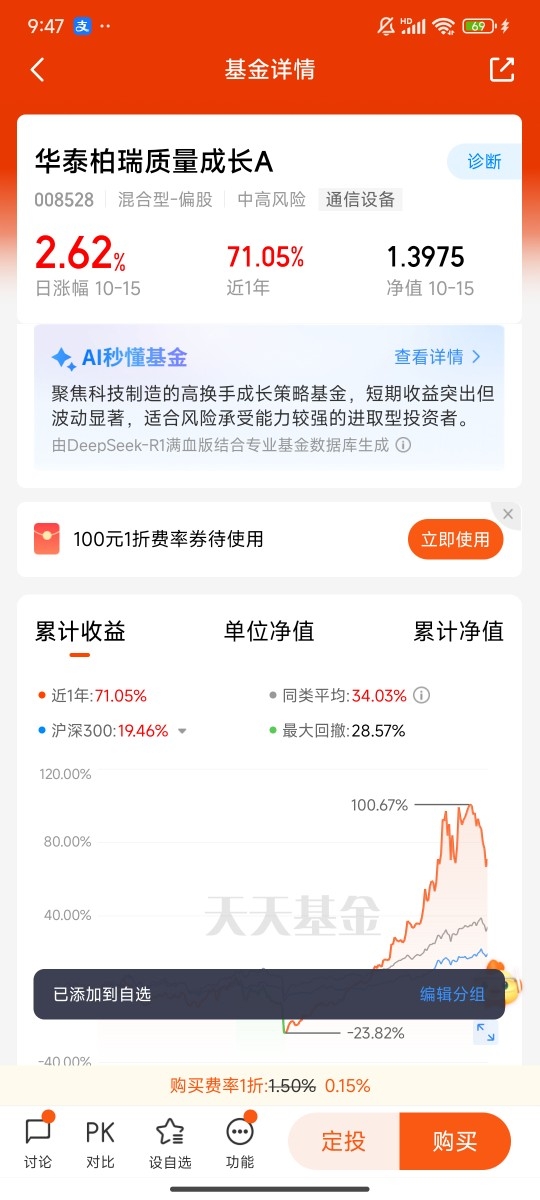 最后,实打实的业绩让我愿意托付资金。截至2025年8月29日,华泰柏瑞质量成长A类年内回报达到105.21%,远超14.87%的同期业绩基准;即便经历了近期的板块调整,基金依然展现出强弹性,10月15日单日涨幅达2.62%,最新净值维持在1.3975元。拉长时间看,2025年上半年它实现了19.05%的收益,显著跑赢4.51%的基准。这样的业绩表现,既证明了基金经理的选股能力,也说明它能在产业趋势中抓住机会,是值得信赖的投资工具。