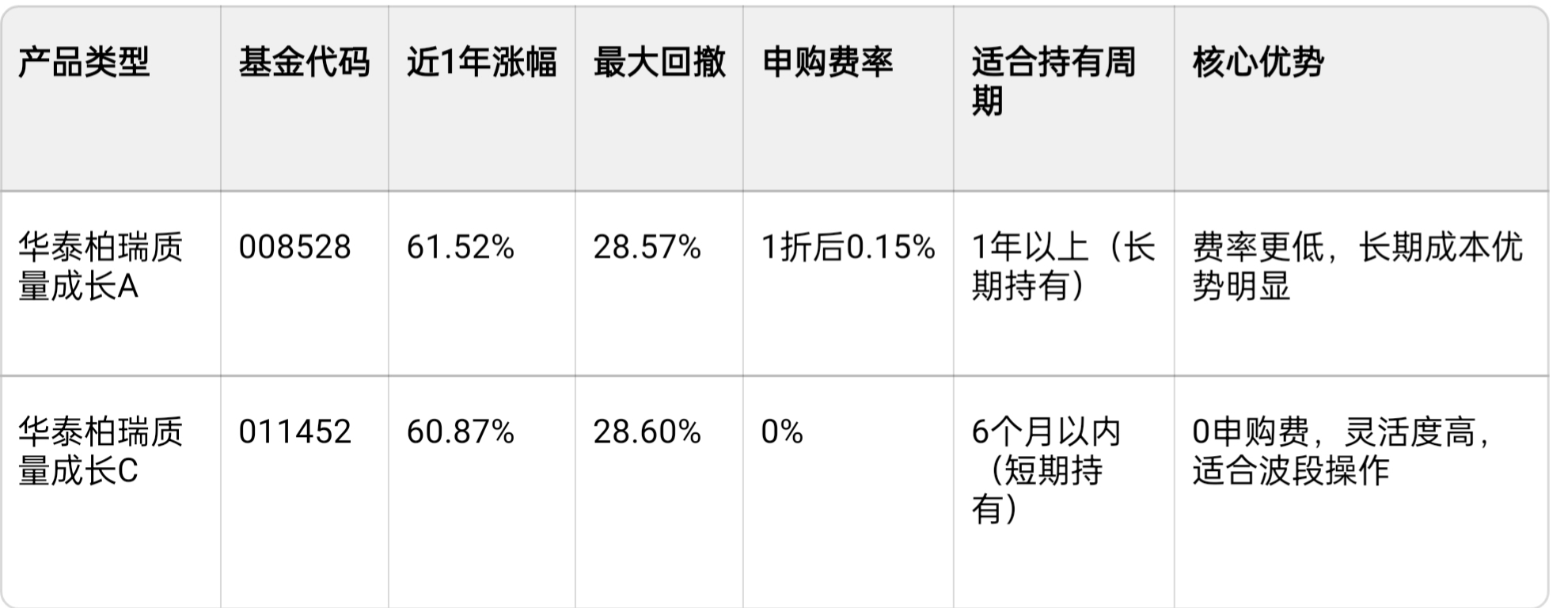 在具体投资工具选择上,普通投资者需根据自身持有周期匹配产品,避免因费率或灵活性问题影响收益。以华泰柏瑞质量成长A/C为例,两者的核心差异如下图所示,可作为选择参考: