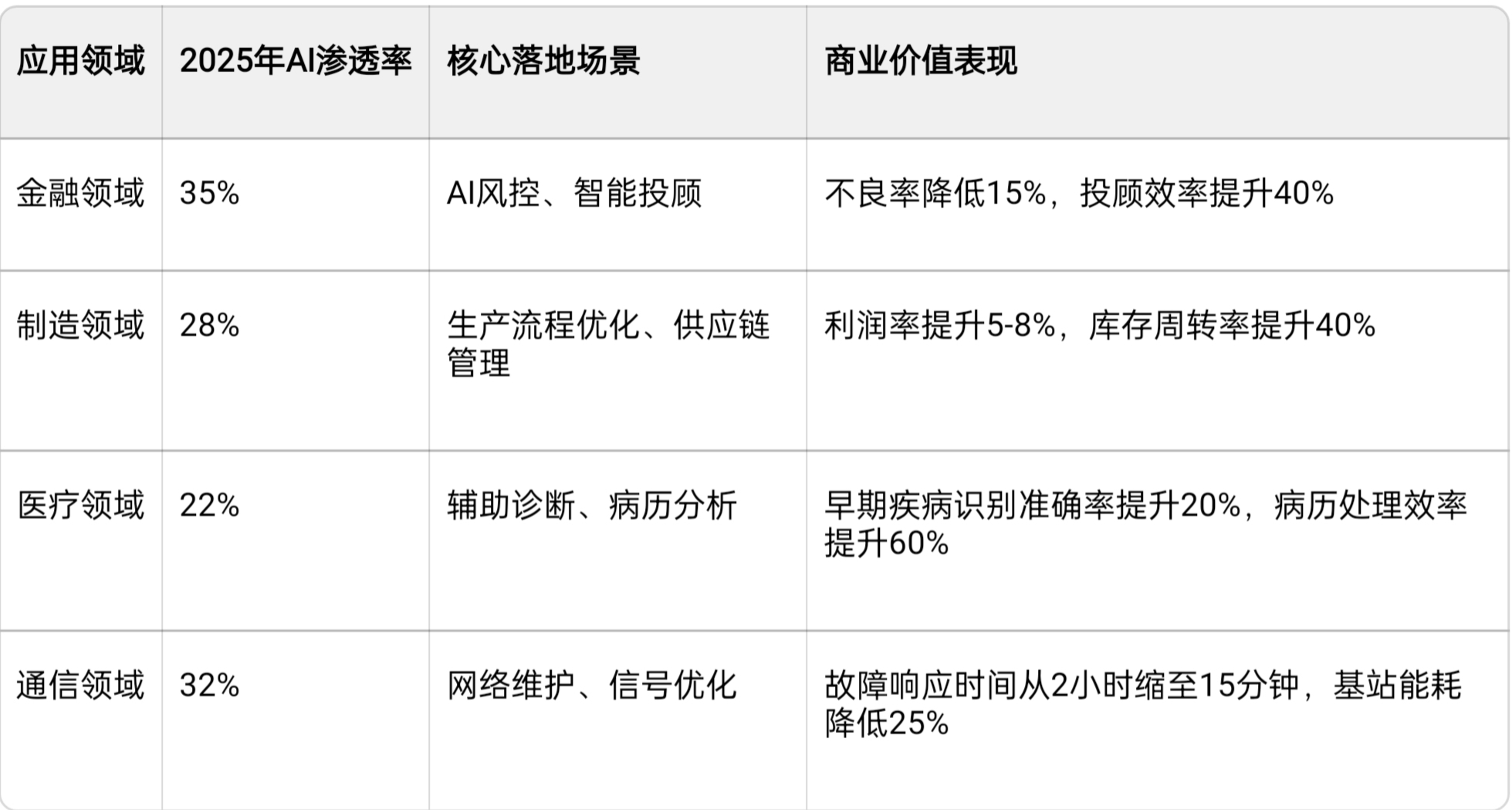 另一方面,AI的商业化闭环正在加速形成,从“概念”走向“实绩”的速度远超预期。从行业渗透数据来看,2025年AI在多个关键领域的渗透率已实现显著突破,具体数据如下图所示: