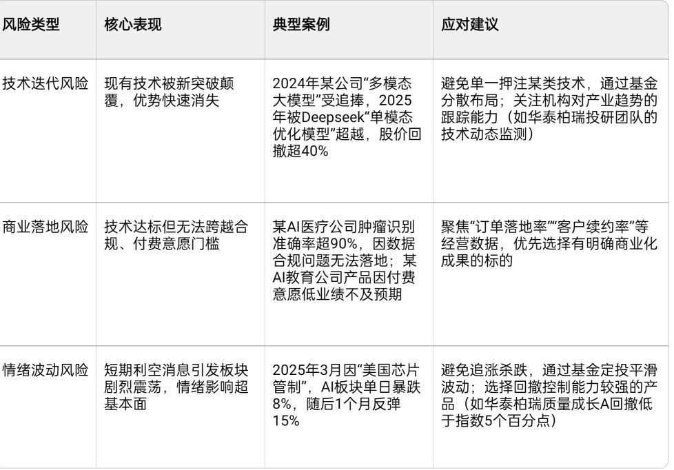 面对165.5%的指数涨幅,很多投资者容易忽略一个关键事实:AI产业仍处于“发展初期”,不确定性才是这个赛道的常态。这种不确定性,主要体现在三个方面,具体风险特征及应对建议如下图所示: