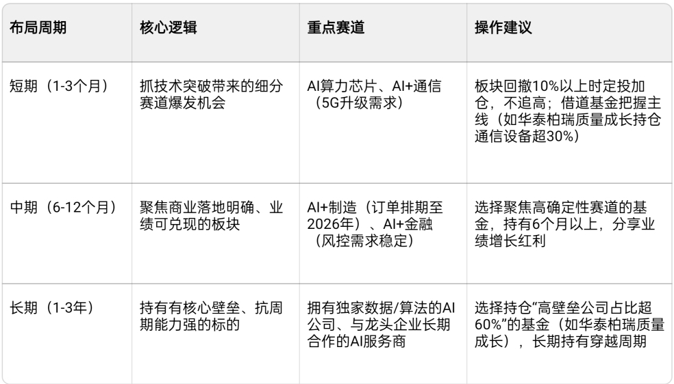 结合AI产业的特点和自己的投资经验,我总结出一套适合普通投资者的“全周期布局逻辑”,不同周期的核心策略与重点方向如下图所示: