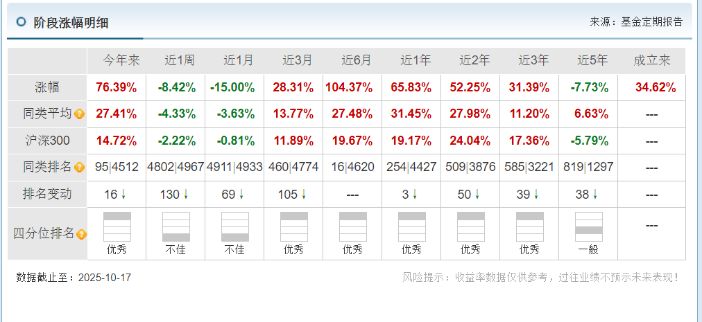 短期表现突出:截至2025年10月17日,年内收益率76.39%,近一年收益率65.83%,主要受益于AI算力链个股的强势反弹。