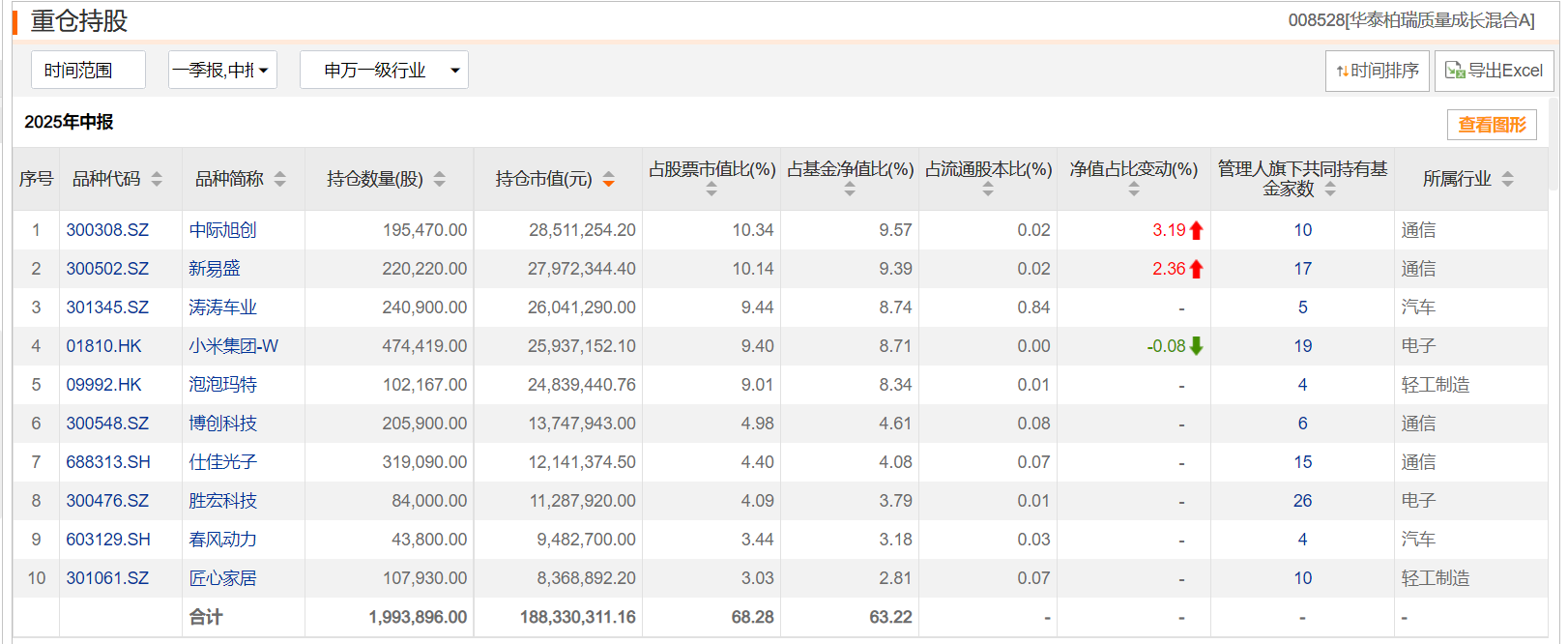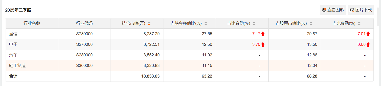 重仓AI算力,暴露周期属性2025年二季报显示,基金q前3大行业是通讯、电子、汽车都是AI算力相关行业。