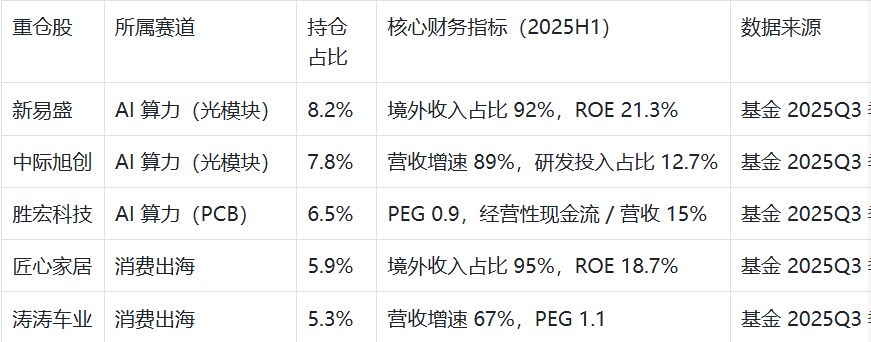 AI 产业链持仓占比达 36.7%(超预期转型目标),且全部满足 “ROE≥15%+PEG≤1.2” 筛选标准,消费出海标的作为平衡配置,形成 “科技成长 + 现金流安全垫” 的长期组合逻辑。
