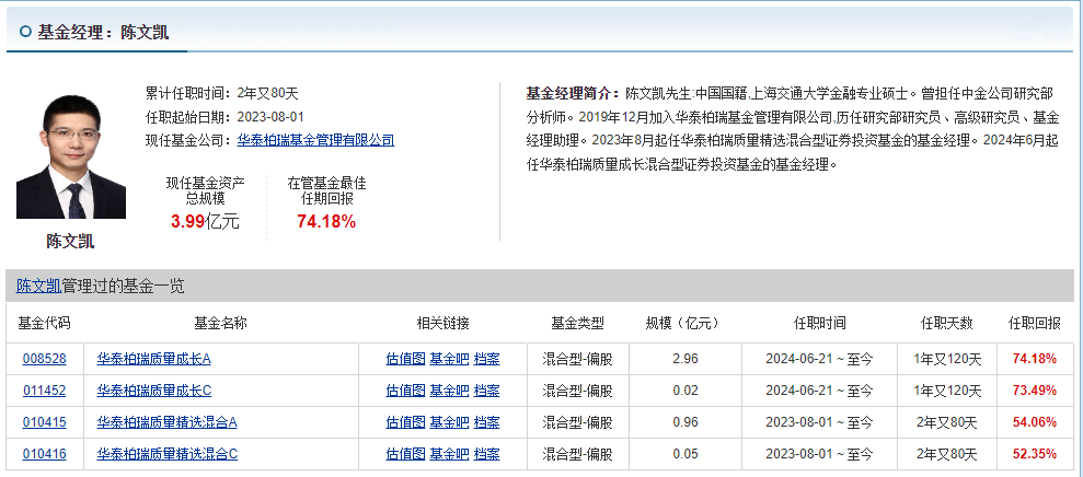 先介绍下陈文凯,本科毕业于中科大,硕士毕业于上海交大,曾任中金公司分析师,2019年加盟华泰柏瑞基金,2024年2月份开始独立管理基金,目前在管产品包括华泰柏瑞质量成长(A类008528,C类011452)和华泰柏瑞质量精选混合(A类010415,C类010416),任职汇报均超过50%,居同类基金前列。