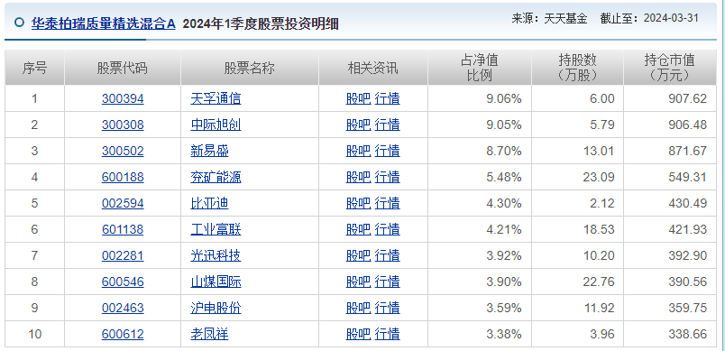 例如华泰柏瑞质量成长(A类008528,C类011452)2024年一季报显示,重仓股从之前的白酒、CPO、煤炭调整为CPO、服务器、煤炭、新能源和黄金,大幅提升了AI的权重占比,易中天成为组合的扛把子,每只个股的权重均在9%附近,较早参与且较为完整参与了这轮AI行情。