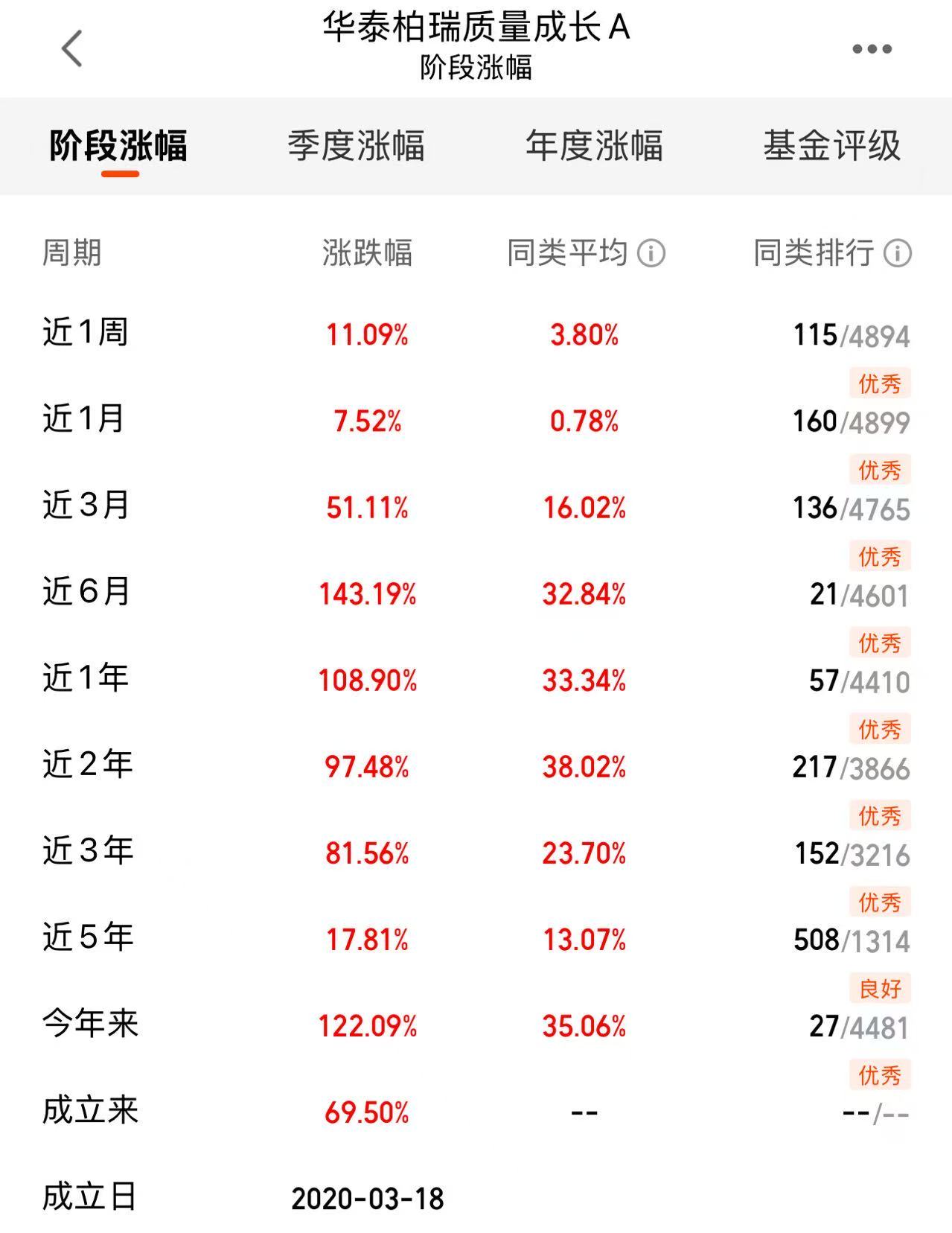 从其投资框架来看,是从中观产业视角出发,精选业绩确定性相对强的个股,并在合理估值下进行配置。首先是以中观产业研究为起点,努力挖掘可持续成长的行业,构建组合的基础。通过对行业成长空间和成长斜率的研究预判,结合目前所处行业生命周期阶段分析,挖掘出在3-5年甚至更长时间维度下,业绩确定性相对较高的行业。其次是精选个股:业绩确定性是选股的硬标准。再次是估值考量:动态权衡风险与收益。今年以来,他管理的华泰柏瑞质量成长,在这一波行情中脱颖而出。