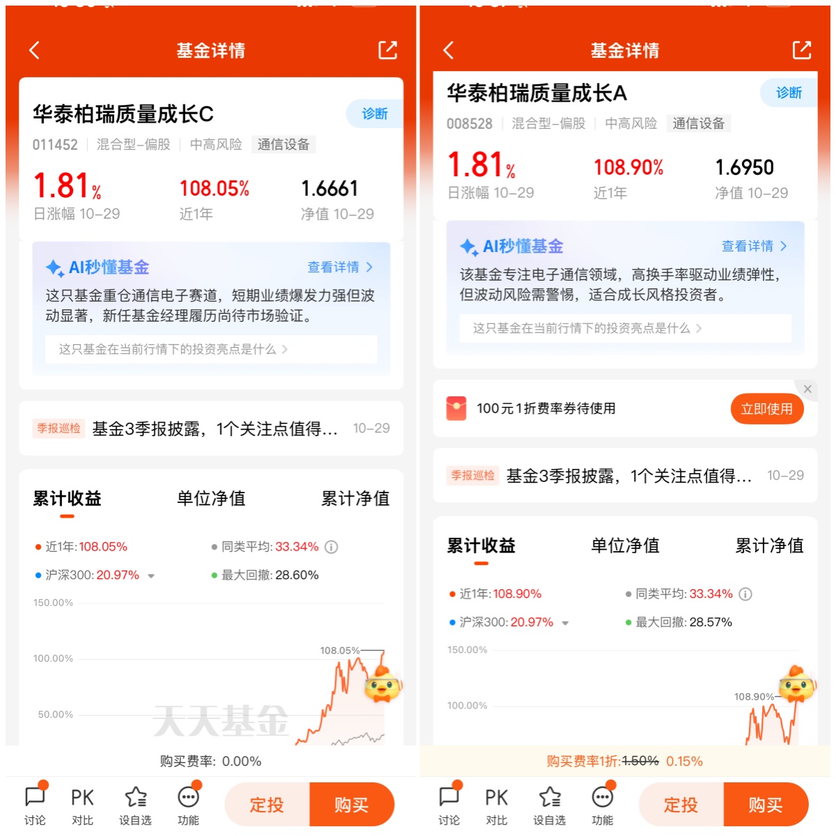 该基金A类成立于2020年3月初,C类成立于2021年2月初。作为一只科技成长类的混合型基金,华泰柏瑞质量成长可以说将基金经理自身所学和长期积累发挥的得心应手,细看基金收益曲线,该基金的超额收益几乎是一条斜率很陡、连续向上的曲线。截至2025年10月29日,其中华泰柏瑞质量成长A近1年净值增长率108.90%,今年以来净值增长率122.09%,近半年净值增长率143.19%,各阶段来看均大幅跑赢同期业绩比较基准和同期沪深300指数。基金夏普比率为2.05,优于89%同类基金,显示出单位风险下超额收益能力较强。这一成绩背后,既有陈经理对AI算力行业趋势的敏锐判断,也有对个股的深度挖掘和前瞻布局。