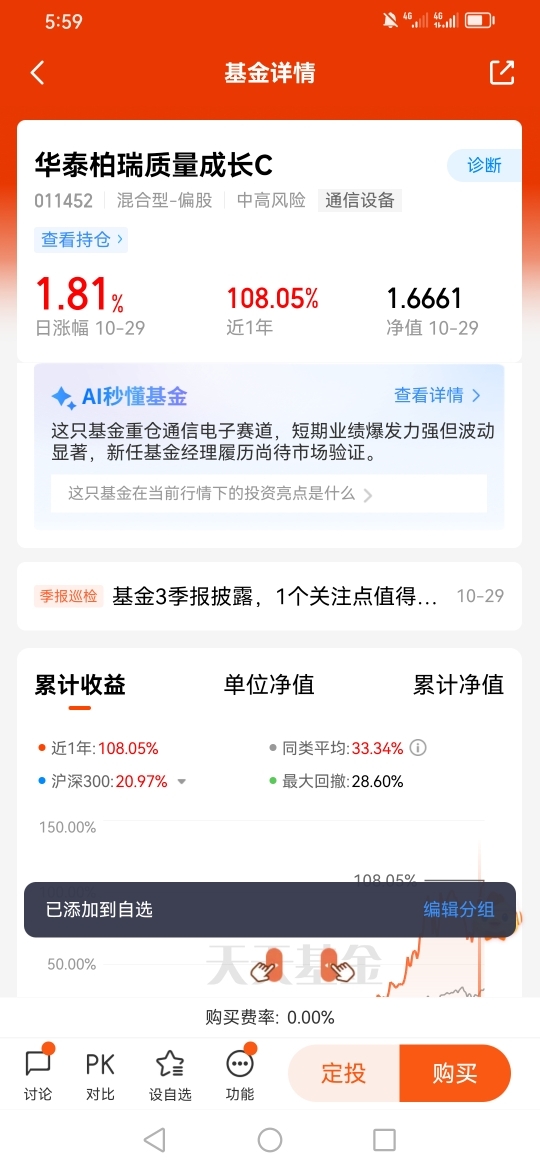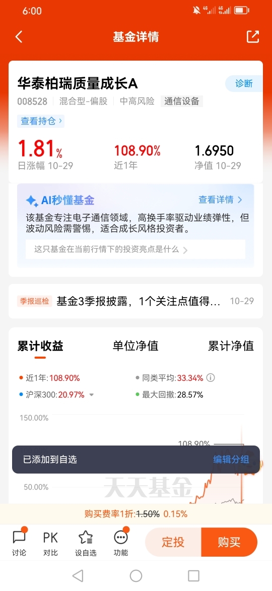 因此我选择的是华泰柏瑞质量成长A(008528),因为华泰柏瑞基金在投资领域相当专业,而且这款基金在今年的表现也是有目共睹的。@华泰柏瑞基金
