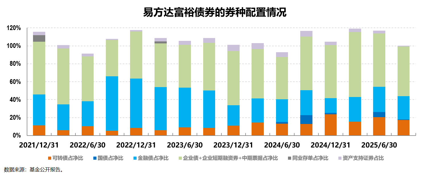 在实际的运作中,我们可以看到组合的股票仓位均不超过20%,自2021年四季度末至2025年三季度末的平均股票仓位为17.12%;相应的其债券仓位从未低于过80%,自2021年四季度末至2025年三季度末的平均债券仓位为102.95%。
