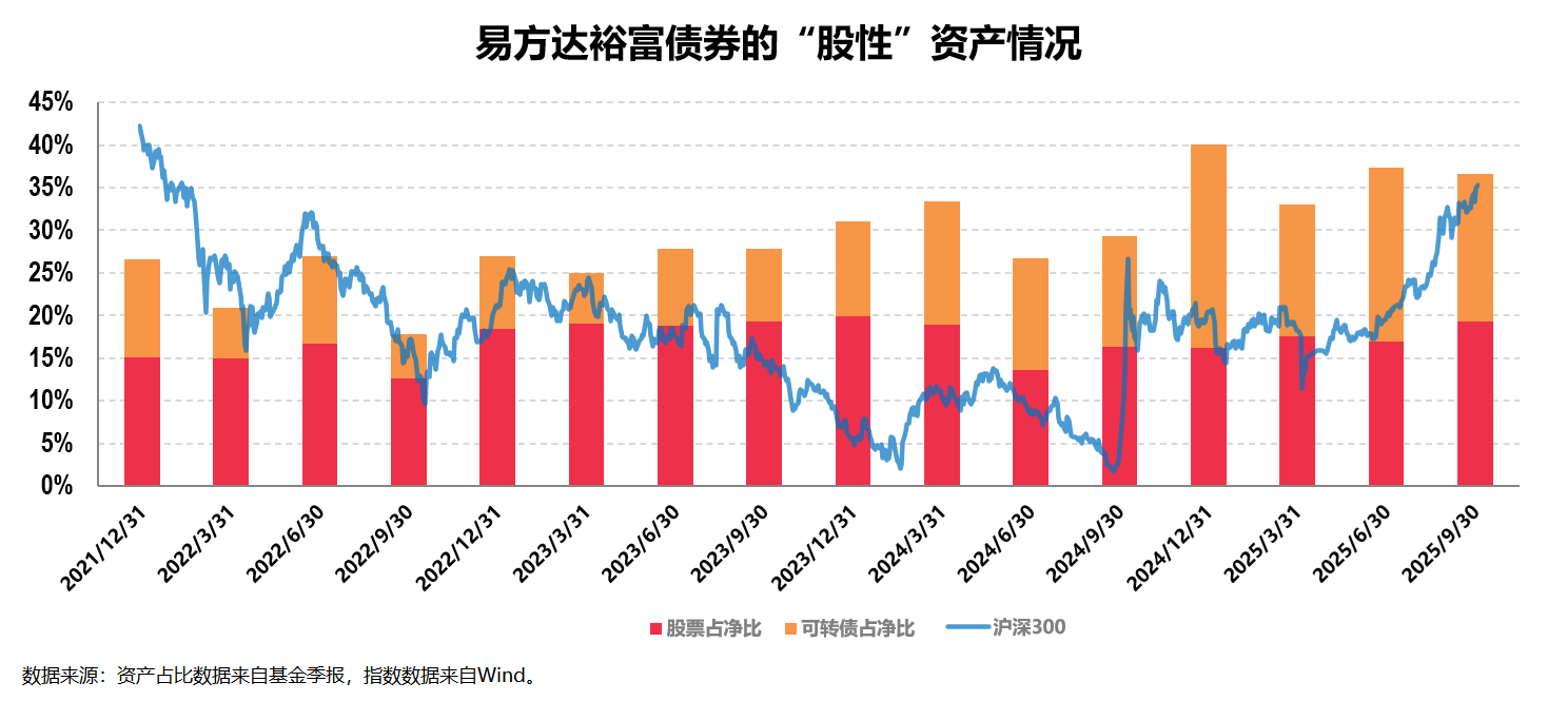 因此,我们这里基于历史持仓数据,把股票和可转债这两类“股性”资产和权益市场典型宽基指数代表沪深300放在一起做个简单对比: