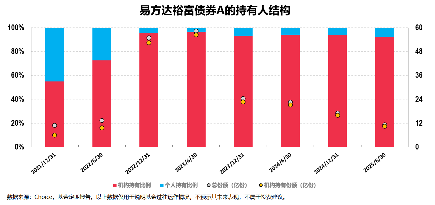 从历史数据来看,机构投资者始终持有较大比例该产品,2021年末以来机构投资者的历史平均持有占比超过85%。2025年中报显示,该产品的机构投资者占比为92.23%,足见机构对这只产品以及基金经理的高度认可。