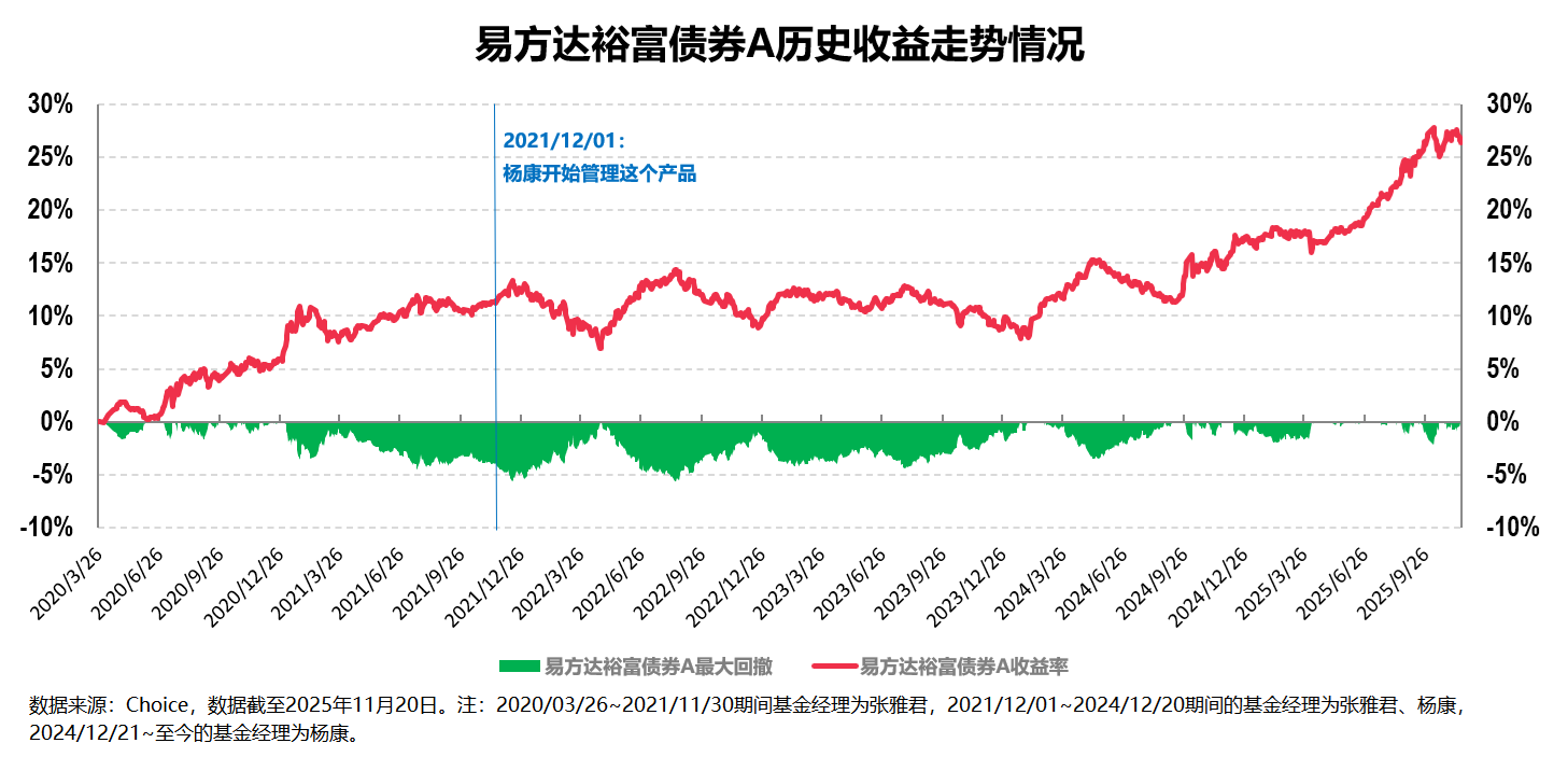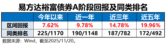 根据Wind数据,截至2025年11月20日,该产品今年以来的区间回报为7.62%,在全市场的二级债基中位列前19%(225/1170),相应的最大回撤为-2.14%;其近三年和近五年的区间回报分别为14.78%和19.96%,在全市场的二级债基中分别位列前24%和前35%,相应的最大回撤分别为-4.40%和-5.68%。