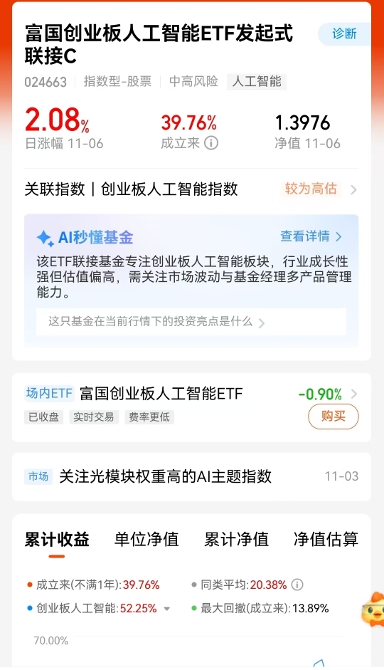 押注了天弘证券C打底,又配了点富国创业板人工智能ETF联接C,近6个月翻身了40%,超过大多数同类,AI方向性这波发展真猛。
