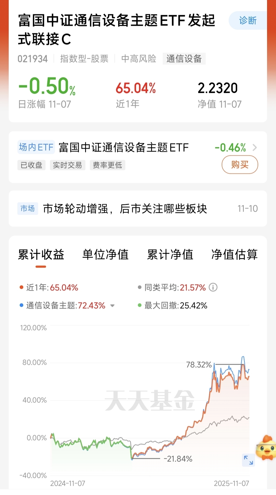 配了点证券ETF后,又加仓了富国通信设备ETF联接C,近6个月正报酬了90%,跑