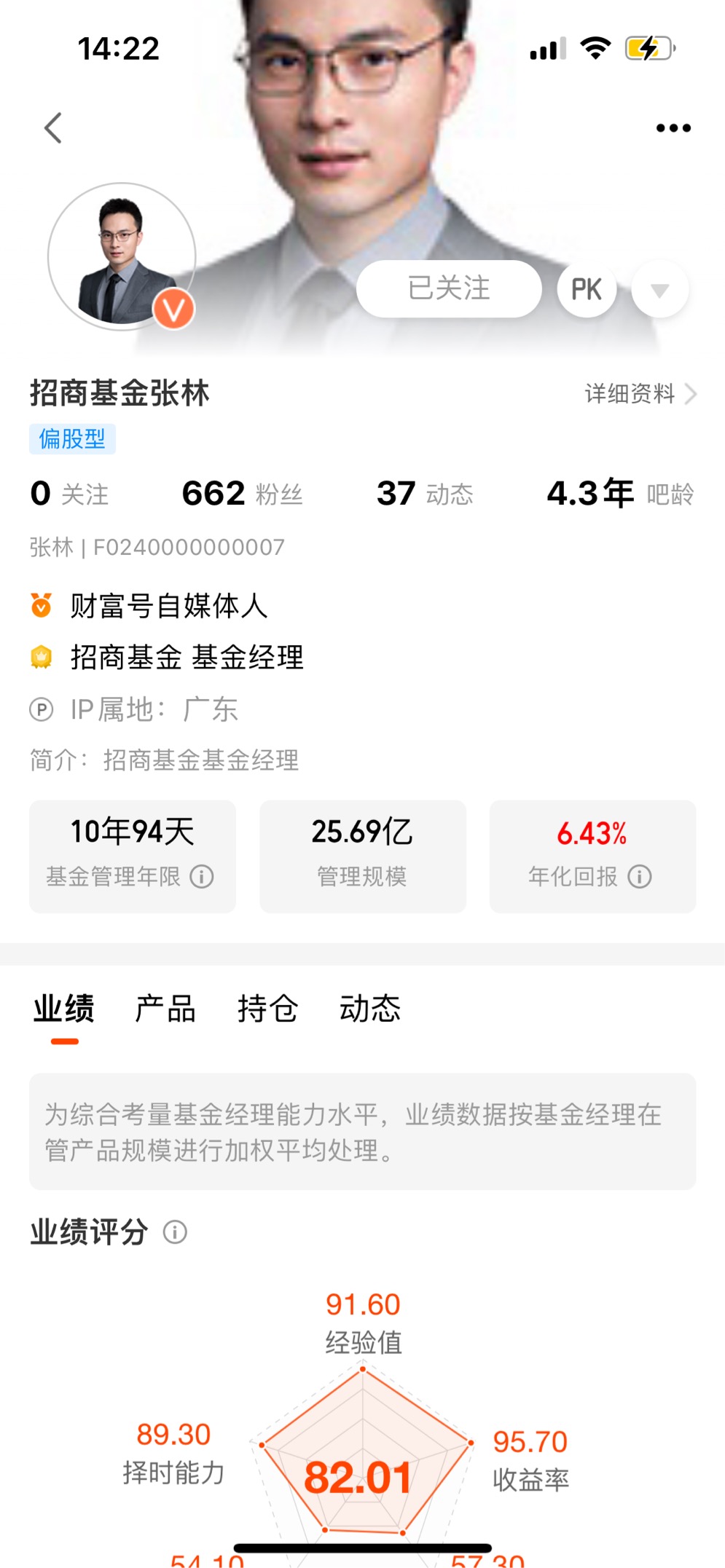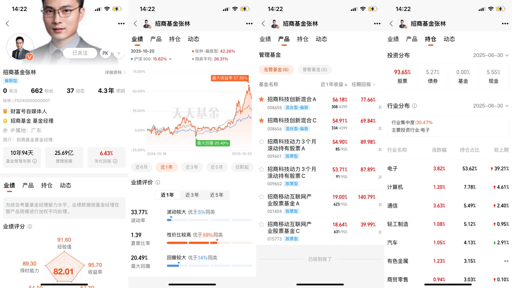 从他管理的其他产品来看,招商科技创新混合C近1年收益54.91%,招商科技动力3个月滚动持有股票A近1年收益54.90%,这些产品的优异表现也从侧面印证了张林在科技投资领域的专业能力。他的年化回报达到6.43%,在同类基金经理中处于上游水平,业绩评分82.01,其中经验值91.60、收益率95.70,充分彰显了他作为科技投资猎手的实力。