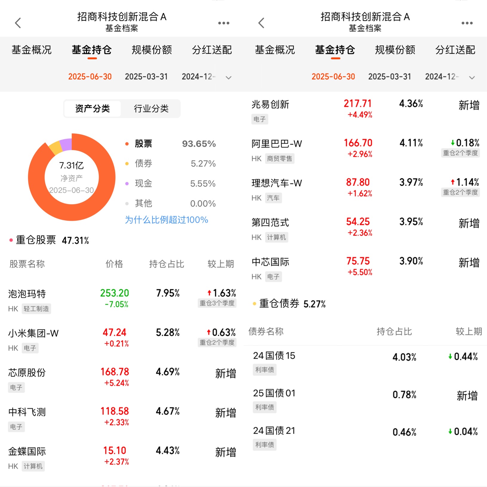 招商科技创新混合A的持仓呈现出“科技赛道深耕与灵活调仓结合”的特点。在个股选择上,基金重仓了小米集团-W(5.28%)、中芯国际(3.9%)等兼具技术壁垒与市场渗透空间的企业。小米在消费电子和智能汽车领域的布局,中芯国际在半导体制造领域的地位,都体现了基金对具有核心竞争力企业的青睐。值得注意的是,基金的港股持仓占比超过20%,如小米集团-W、阿里巴巴-W、理想汽车-W、金蝶国际、第四范式等,这些港股科技龙头企业为基金提供了更广阔的投资视野,也带来了汇率波动的风险,需要投资者关注。从组合管理特征来看,基金前十大持仓集中度47.31%,配合3年448.83%的换手率,反映出“趋势跟踪与价值挖掘并重”的投资风格。既对那些处于上升趋势的优质标的进行集中持仓,又通过高换手率及时挖掘新的投资机会,这种风格使得基金能够在科技板块的轮动中始终占据有利位置。