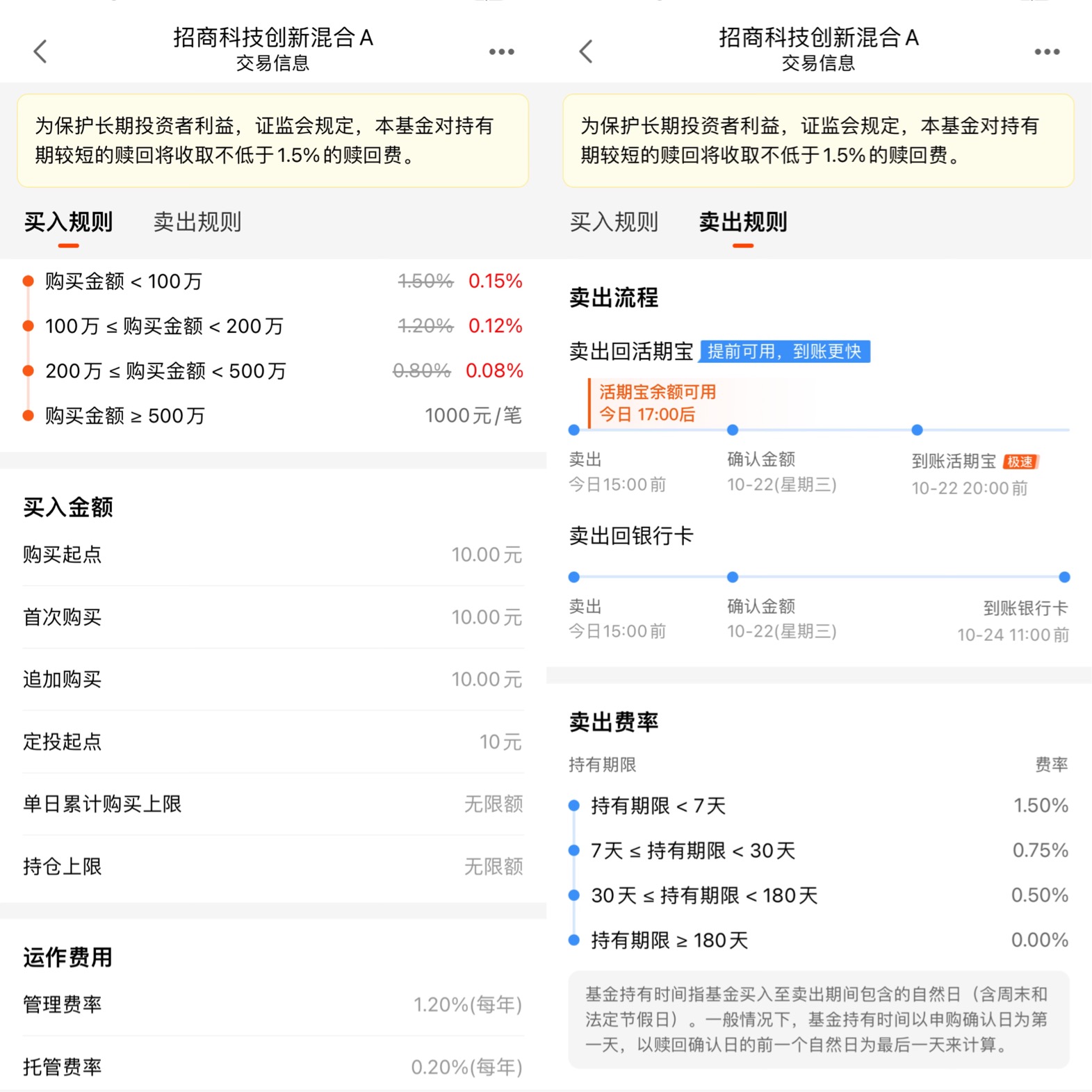 招商科技创新混合A的交易规则相当亲民,购买起点仅为10元,定投起点也为10元,这使得普通投资者都能轻松参与。在买入费率方面,购买金额<100万时费率为0.15%(1折优惠),100万≤购买金额<200万时为0.12%,200万≤购买金额<500万时为0.08%,购买金额≥500万时为1000元/笔,这种费率结构对于不同资金量的投资者都比较友好。在卖出费率方面,持有期限<7天费率为1.50%,7天≤持有期限<30天为0.75%,30天≤持有期限<180天为0.50%,持有期限≥180天为0.00%。这种费率设置旨在鼓励长期投资,减少短期频繁交易对基金运作的影响。基金的管理费率为1.20%/每年,托管费率为0.20%/每年,这在同类主动管理基金中处于合理水平,体现了基金公司的专业价值。