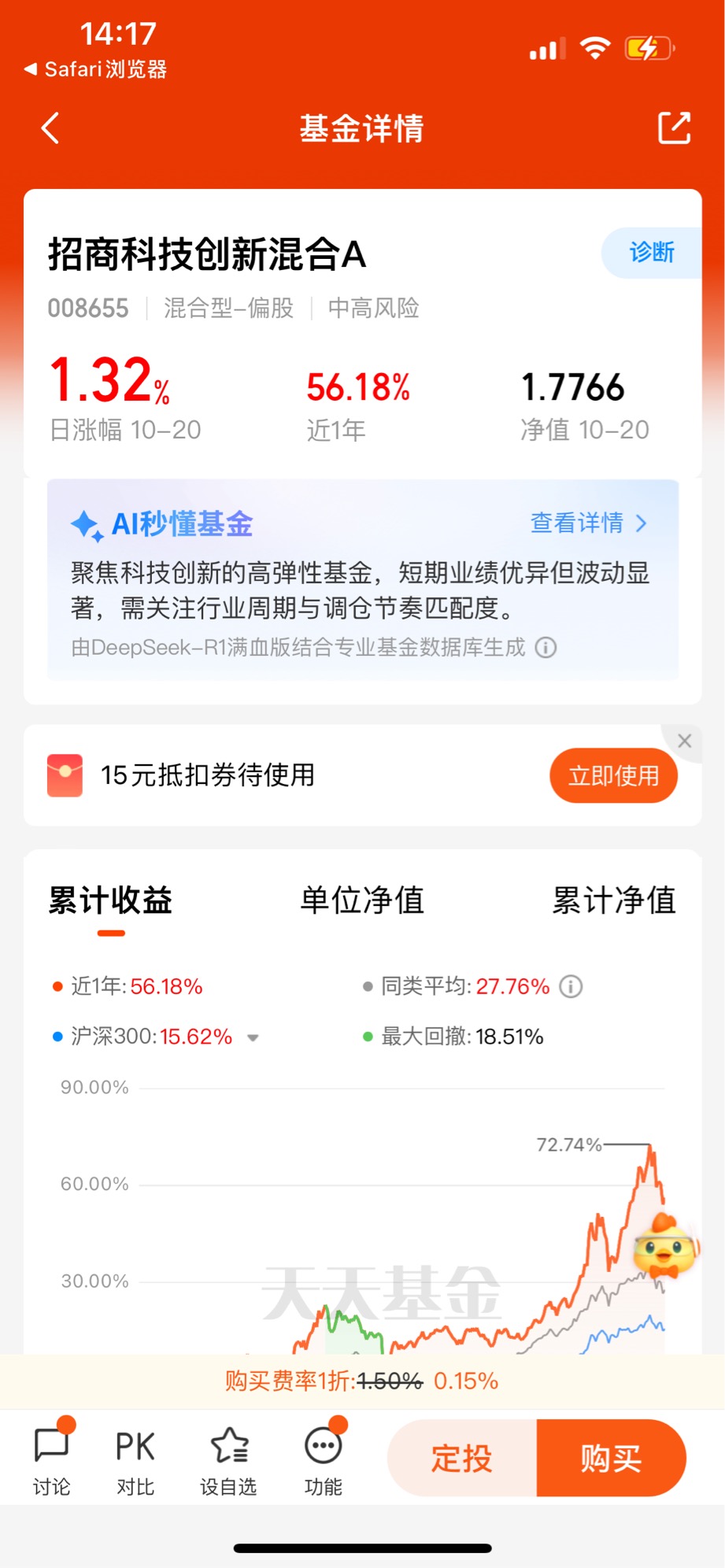 评价一只基金,业绩永远是最直观的标尺。招商科技创新混合A的业绩表现可以用“惊艳”来形容。近1年收益率高达56.18%,在同类基金中排名前7%,将同类平均27.76%的收益率远远甩在身后,更是大幅跑赢沪深300指数15.62%的涨幅。这意味着,在过去一年里,持有这只基金的投资者能获得远超市场平均水平的回报,充分享受了科技板块上涨的红利。