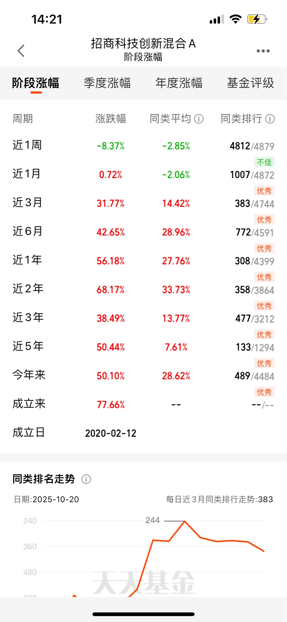 如果把时间维度拉长,它的表现同样可圈可点。近2年收益率68.17%,同类平均33.73%;近3年38.49%,同类平均13.77%;近5年50.44%,同类平均7.61%。从成立以来更是斩获了77.66%的收益。这些数据清晰地表明,无论市场环境如何变化,招商科技创新混合A都能在中长期维度上为投资者创造稳定且超额的收益,展现出强大的穿越周期能力。