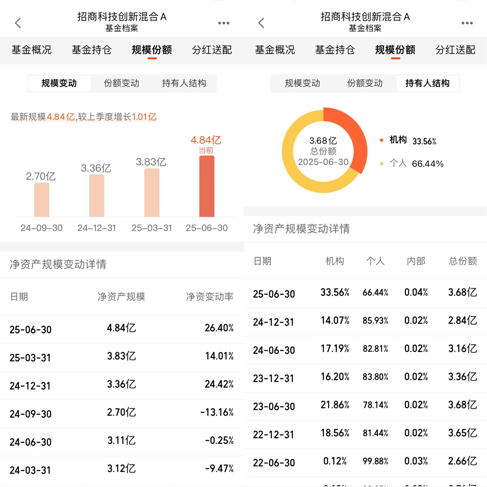 截至2025年6月30日,招商科技创新混合A的规模为4.84亿元,较上季度增长1.01亿,规模呈现出稳步增长的态势。这种增长一方面源于基金业绩的优异表现,吸引了新的投资者;另一方面也反映出市场对科技板块和该基金的认可。从持有人结构来看,机构持有比例33.56%,个人持有比例66.44%。机构投资者通常具有更专业的投研能力和更严格的投资标准,他们的持仓比例较高,说明机构对这只基金的投资价值较为认可。而个人投资者的广泛参与,则体现了这只基金在普通投资者中的受欢迎程度。这种持有人结构是比较健康的,机构和个人投资者的共同参与,既为基金带来了稳定的资金来源,也有助于形成多元化的投资视角。