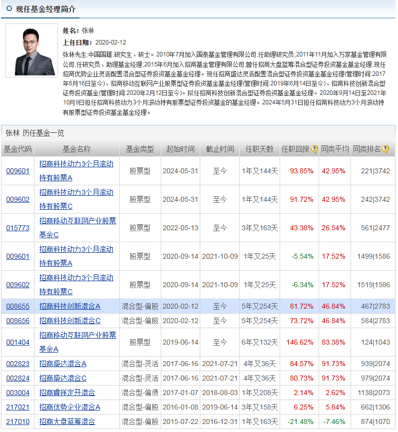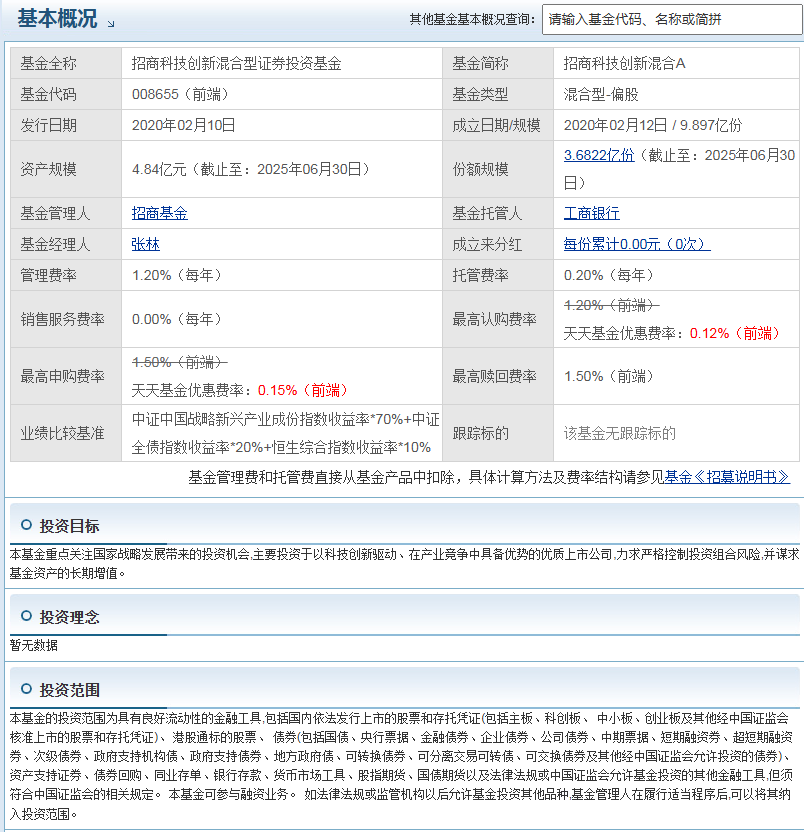 招商科技创新混合A成立于2020年2月12日,业绩比较基准为中证中国战略新兴产业成份指数收益率70% + 中证全债指数收益率20% + 恒生综合指数收益率10%,属于偏股混合型基金,长期投资于TMT股票。基金经理是张林,他目前管理的3只基金近一年均为正收益,其中招商科技创新混合A近一年复权单位净值增长率最高,达87.36%。