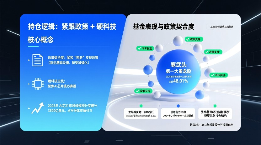 作为新手,我看不懂复杂的财报,但会看基金的持仓方向和政策契合度。根据2024年四季报,这只基金前十大重仓股仓位达48.01%,第一大重仓股是寒武纪(AI芯片龙头),还逐步增持了和“两新支持政策”相关的汽车、汽车零部件和家电领域个股。