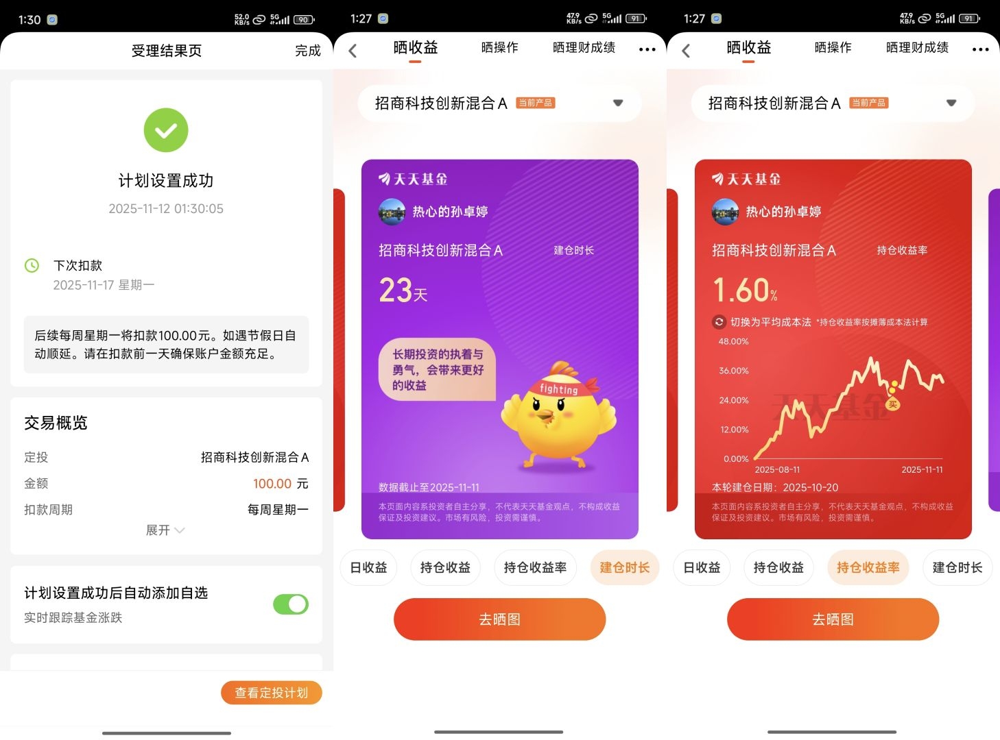 作为刚毕业3个月的职场新人,月薪扣完五险一金只剩5k+,既要攒房租又要留生活费,能拿来理财的钱少得可怜。今年10月看着科技板块回暖,咬咬牙入手了招商科技创新混合A(008655),至今收益1.6%,不算惊艳但足够安心——更重要的是,我已经把“每周周一定投100元”设成了自动扣款,打算跟这只基金、跟科技板块死磕到底