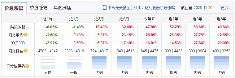 基金在不同市场周期中均表现出良好的适应性。在2023年科技板块调整期间,基金收益率为-4.94%,但随后快速修复,2024年收益率反弹至15.28%,2025年以来收益达51.16%。这种强劲的修复能力得益于基金经理对产业趋势的精准把握,如在2024年市场恐慌时逆势加仓半导体设备,最终相关持仓反弹超40%。截至2025年11月20日,基金在近1年、近3年等中长期维度排名均位于同类前10%,四分位排名多为"优秀",体现出持续的业绩领先优势。