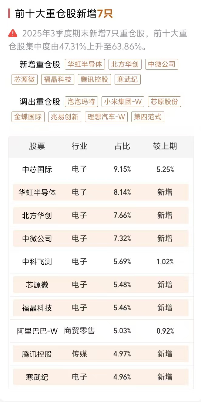 该基金2025年三季度末的前十大重仓股主要集中在AI产业链上游的半导体和硬件领域:
