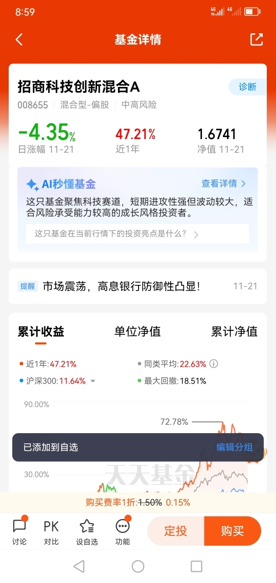 在经过以上认真思考之后,我把招商科技创新混合A(008655)加入到了我的基金自选池,因为它重仓的都是人工智能行业内最优质的公司,它们具备稳定的盈利模式与强大的核心竞争力,是真正的核心资产