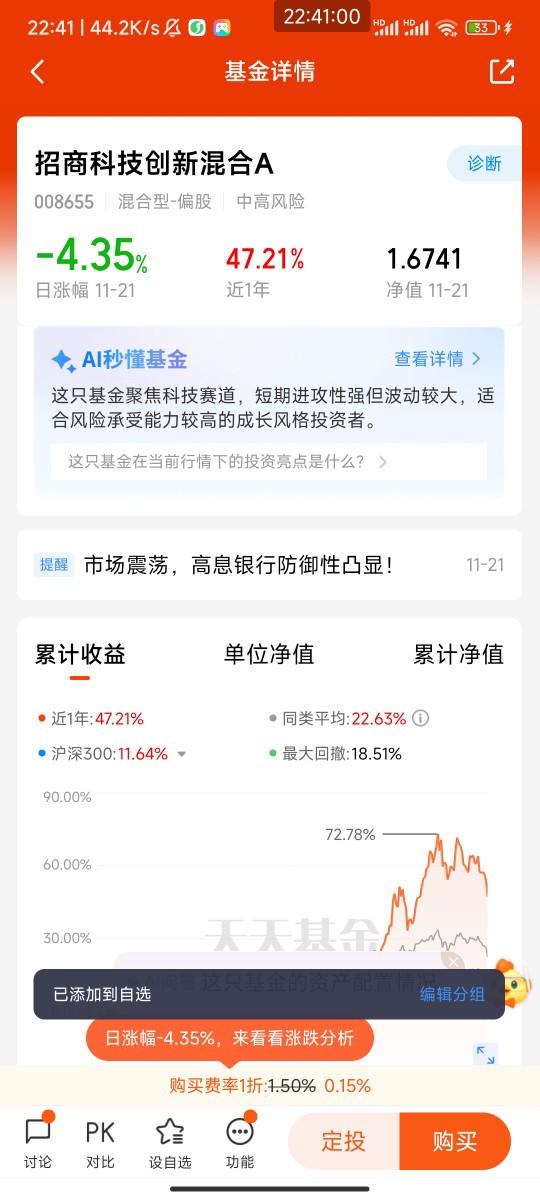 与纯AI主题基金相比,招商科技创新混合A展现出更好的风险收益比。其夏普比率达1.61,最大回撤仅18.5%,在控制波动的同时实现了可观收益。同时,管理费率仅为0.8%/年,低于行业平均水平,长期持有成本优势明显。