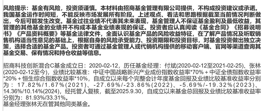 从招商科技创新混合基金2025年中报的持仓可以看到,基金经理张林配置的几个主要方向是:国产人工算力产业链,硬件层面例如GPU和其他定制ASIC厂商等,同时还配置了智驾等AI应用领域。从招商科技创新混合基金的长期业绩表现,我们也可以验证到基金经理张林投资框架的有效性。