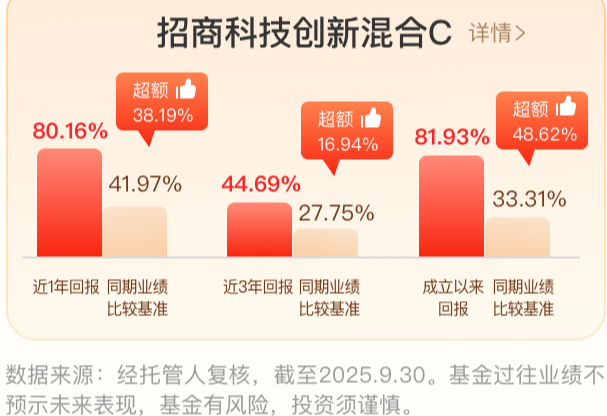 (2)其管理的招商科技创新混合C(OTCFUND|008656)近1年收益率达80.16%(9月30日三季报数据),是同期沪深300指数的3倍多;深耕投研15载、执掌基金近10年的张林,正以独特的 “产业洞察 + 估值把控” 策略,成为科技投资领域的标杆人物。