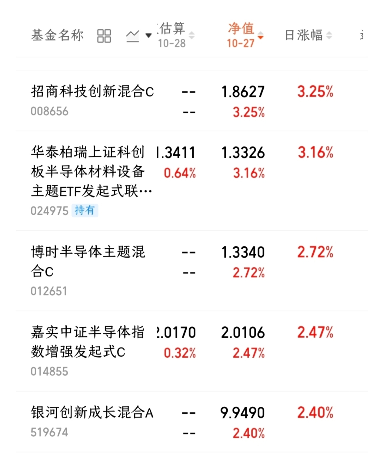 昨天A股开盘就涨了不少,科技股表现特别亮眼,尤其是半导体相关的基金涨得都不错。我看了下自己关注的几只基金,涨幅都在2%以上。
