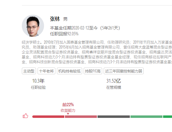 对于基金经理的收益能力评估,我们可以看到,张林经理的收益能力水平位列前22%。