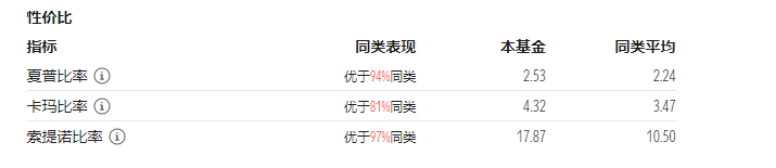 从性价比指标看,三项指标同样均优于同类平均水平。广大投资朋友关注的夏普比率则排名同类前6%。